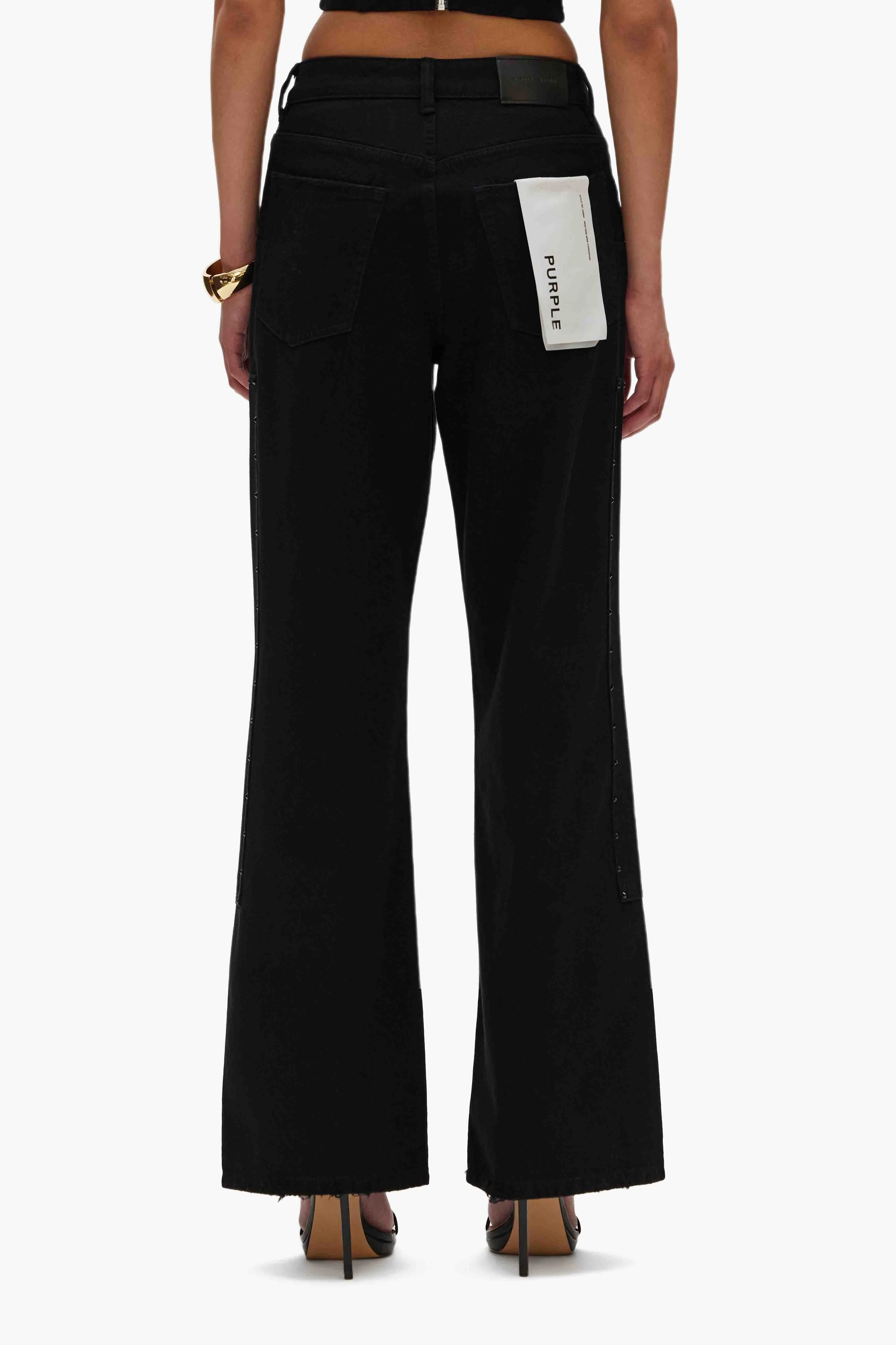 These jeans are classically detailed with double knee panels outlined with rhinestones, a hammer loop, reinforced belt loops, bar-tack stitching for extra durability, and a custom Purple cowhide leather patch.